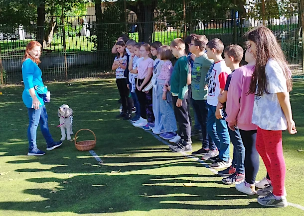 Az egyik állomáson Mixi - az iskola terápiás kutyája - várta a gyerekeket. A szétszóródott gyümölcsöket és szőlőszemeket (labda) kellett a tanulóknak kosárba gyűjteni. Egy pár indulhatott egyszerre, melyből az egyikük a kutyát vitte pórázon - ügyelve, hogy az ne feszüljön - csalogatva a kutyát a gyümölcsökhöz. Ő szedhette fel a labdákat, amiket a másik tanulónál lévő kosárba kellett begyűjteni. Az a páros volt eredményesebb, amelyik több gyümölcsöt gyűjtött az adott idő alatt, és ügyesen bánt a kutyussal is. Mixi a úgy segített a csapatoknak, hogy ő is felkapott egy-egy labdát, és odaadta, hogy a kosárba kerülhessen. Természetesen a végén jutalomfalatot kapott a gyerekektől, akiknek cserébe pacsit adott.