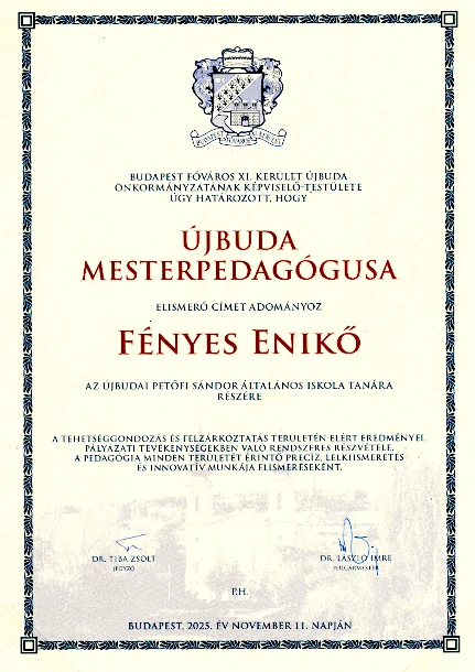 2025. november 11-én Fényes Enikő kollégánk Újbuda önkormányzata képviselő-testületének döntése értelmében az ÚJBUDA MESTERPEDAGÓGUSA elismerő címet kapta, egyebek mellett a tehetséggondozás területén elért eredményeiért, a pályázati tevékenységekben való rendszeres részvételéért.