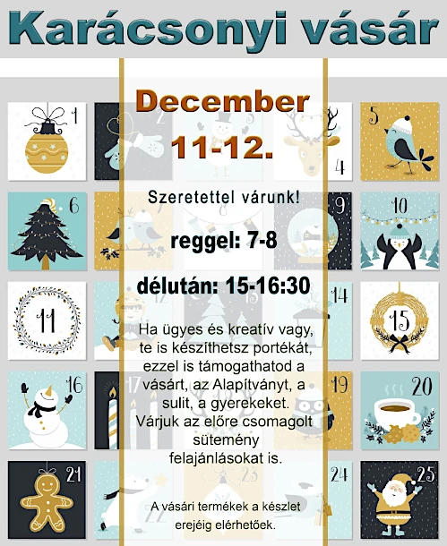 A Petőfi Jövőjéért Alapítvány 2025-ben is megszervezi Karácsonyi vásárt december 11-én és 12-én. Mindként napon reggel 7-től 8-ig, illetve délután 15 órától 16.30-ig várjuk az érdeklődőket az aulában. Bárki, aki kellően ügyes és kreatív, karácsonyi ajándékok, vásárfiák készítésével maga is hozzájárulhat a vásár sikeréhez. A bevételt, mint mindig, iskolánk, a tanulóink támogatására fordítjuk.