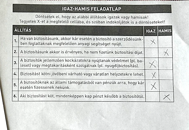 A pénzügyi foglalkozást egy feladvánnyal kezdtük, melyben a "biztosítás" szó volt a megfejtés, ezzel hangolódtunk rá az előadás témájára. Ezután igaz-hamis feladatot oldottunk meg, amely által megismerkedtünk a biztosítás alapjaival.